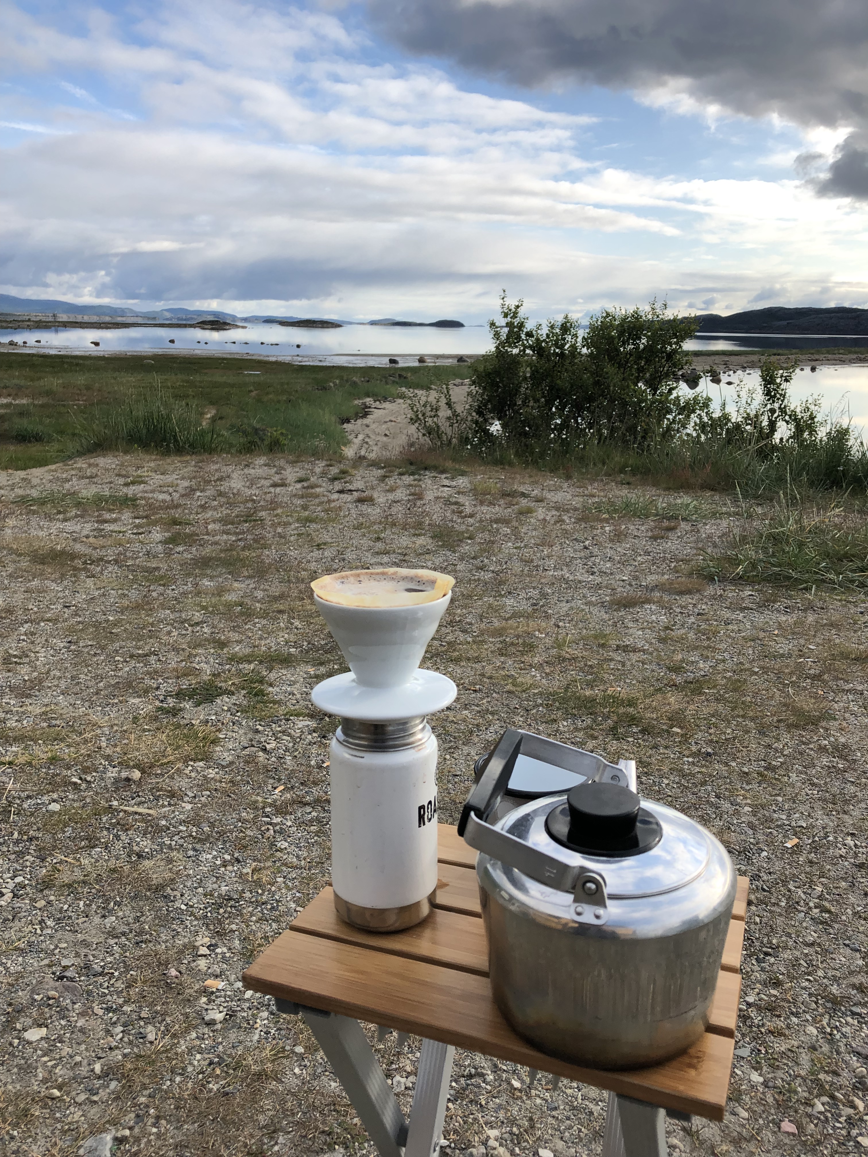 When he finally pulls over we wake to the steel-coloured, beautiful Artic Ocean. We prepare the coffee we skipped at 5 a.m. and take a moment to enjoy the surroundings. It soon becomes obvious that this was only the beginning, though. Steep, rigged rocks to the left, turquoise, dark blue water and rolling green hills to the right while the sun slowly comes out – Norway has got its impressive natural ways to welcome new visitors.