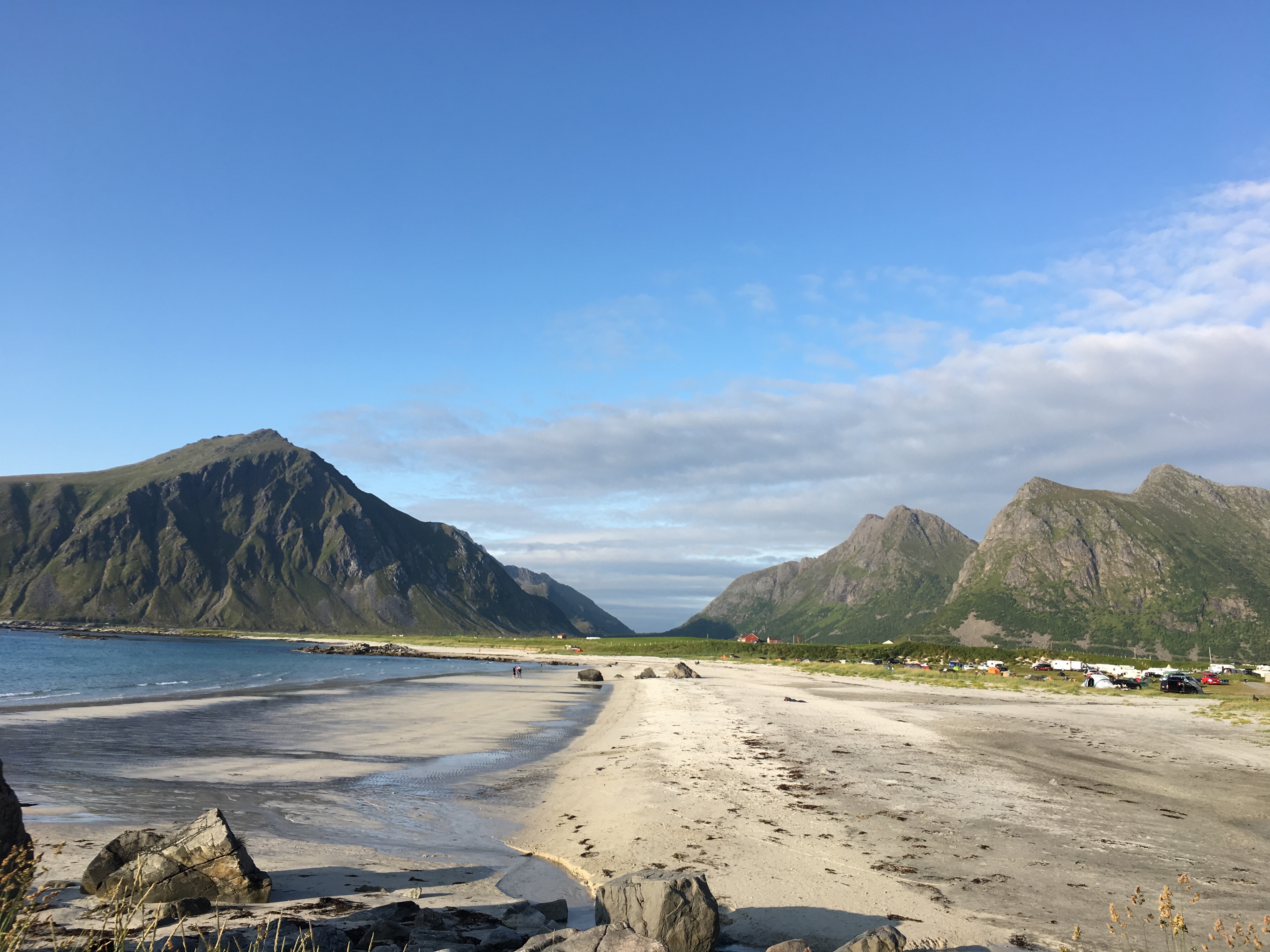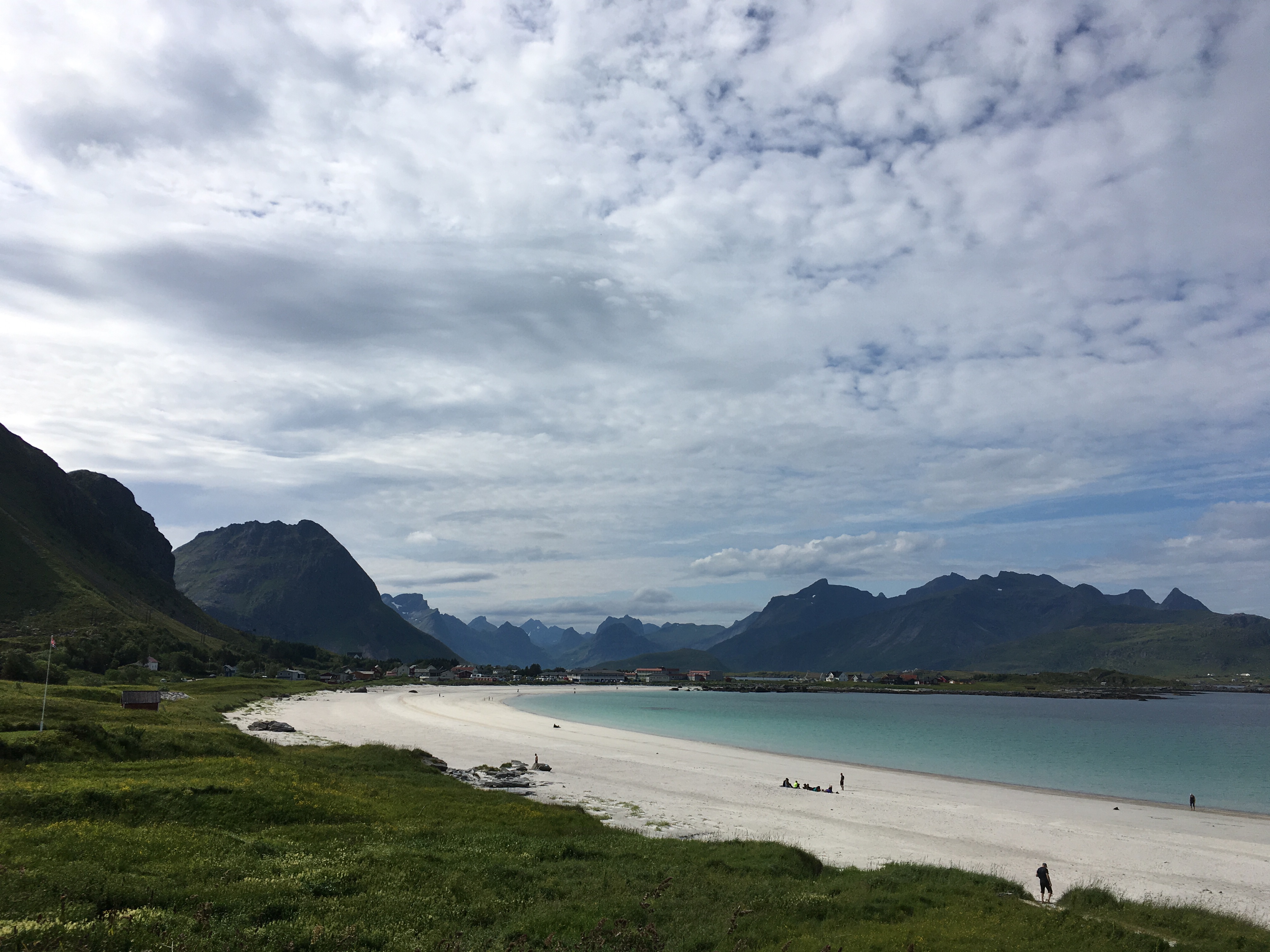 Boy, was I wrong. While Norway in general had already blown me away at first sight, Lofoten in particular might easily count as one of the prettiest places on earth I’ve ever seen. Craggy mountains, some with remaining patches of snow, rise right next to turquoise-blue water and sandy beaches so white they might be mistaken for Caribbean.